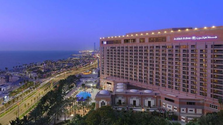 يقع فندق هيلتون في جدة على البحر الأحمر مباشرةً، ويطل على الواجهة البحرية الجديدة في المدينة، يبعد الفندق 5 دقائق عن شاطئ جدة و25 دقيقة عن وسط المدينة، يتميز الفندق بإطلالات ساحرة من الشرفات وحديقة مع نوافير، يوفر الفندق مسابح داخلية وخارجية، ملعبًا للتنس والإسكواش، بالإضافة إلى مركز للياقة البدنية ومرافق سبا، كما يضم أيضًا نادي أطفال، صالة تنفيذية، وغرف اجتماعات.