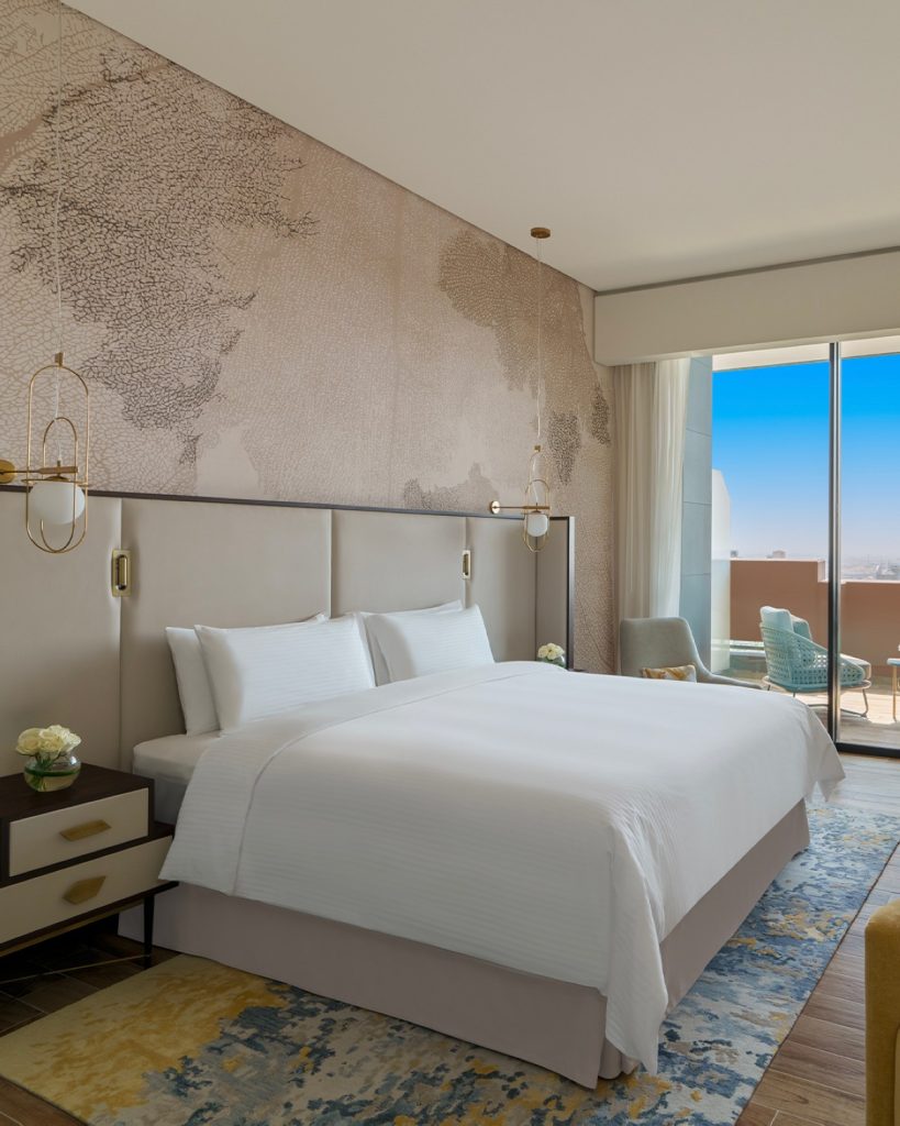 فندق الجريد: يبعد 15 دقيقة بالسيارة عن مناطق البوليفارد، ويتميز بغرف بوتيكية، منتجع صحي، مطاعم عصرية، وجناح عائلي مناسب للعائلات مع مركز لياقة متاح 24 ساعة.