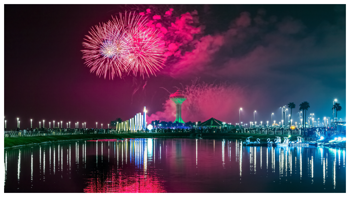 إطلاق الألعاب النارية في مواقع رئيسية مثل برج المملكة بالرياض، وساحة الألعاب النارية في جدة، ومدينة ألعاب الأمواج وجزيرة ستريت، مما يخلق أجواء بهيجة ومبهرة.